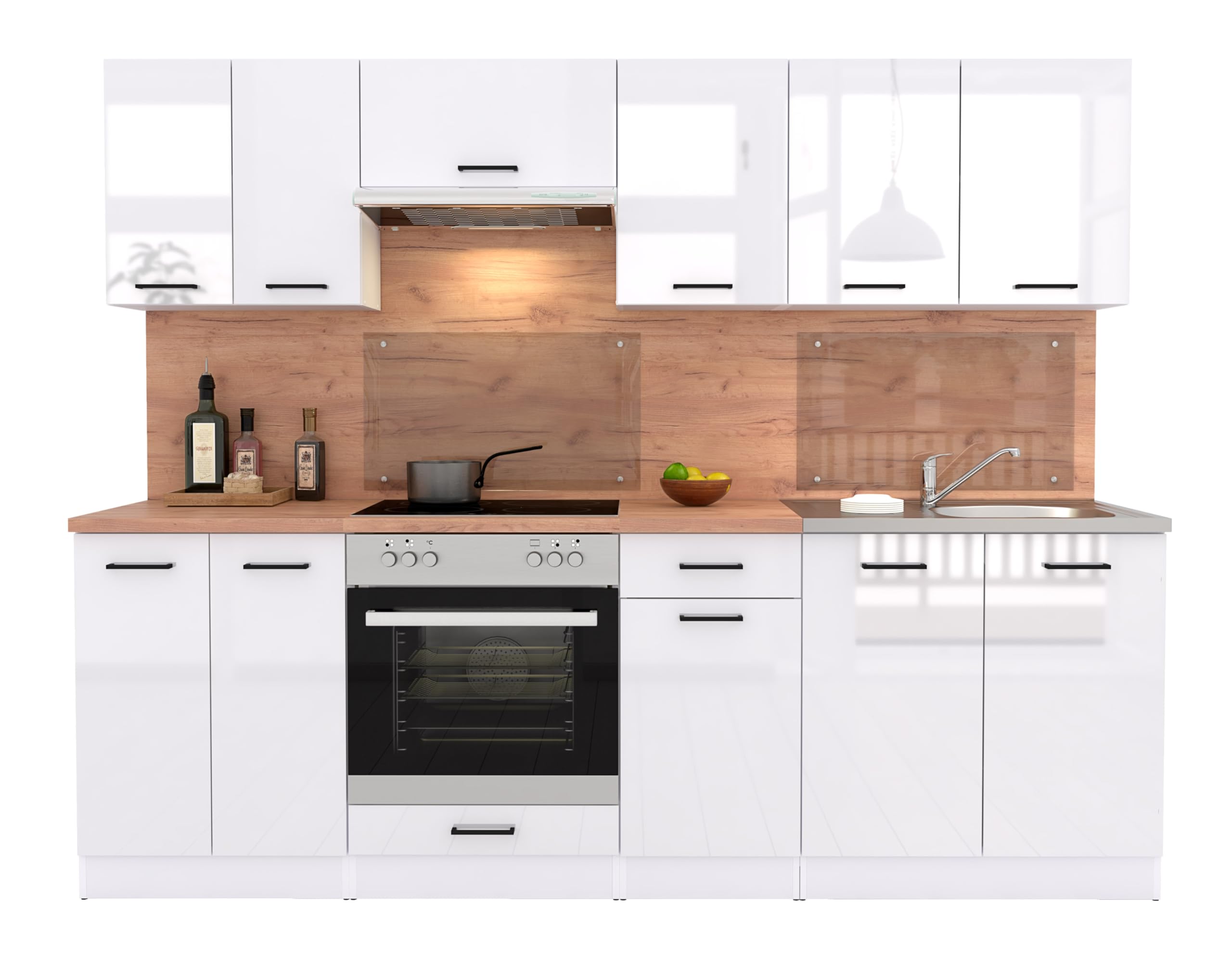 FIWODO Küche mit Elektrogeräten – ERWEITERBAR – Küchenzeile, Einbauküche in Farbe: WEISS GLANZ, 240cm, mit Spülbecken, Mischbatterie, Herd, Backofen, Abzugshaube, NEUWARE mit GARANTIE