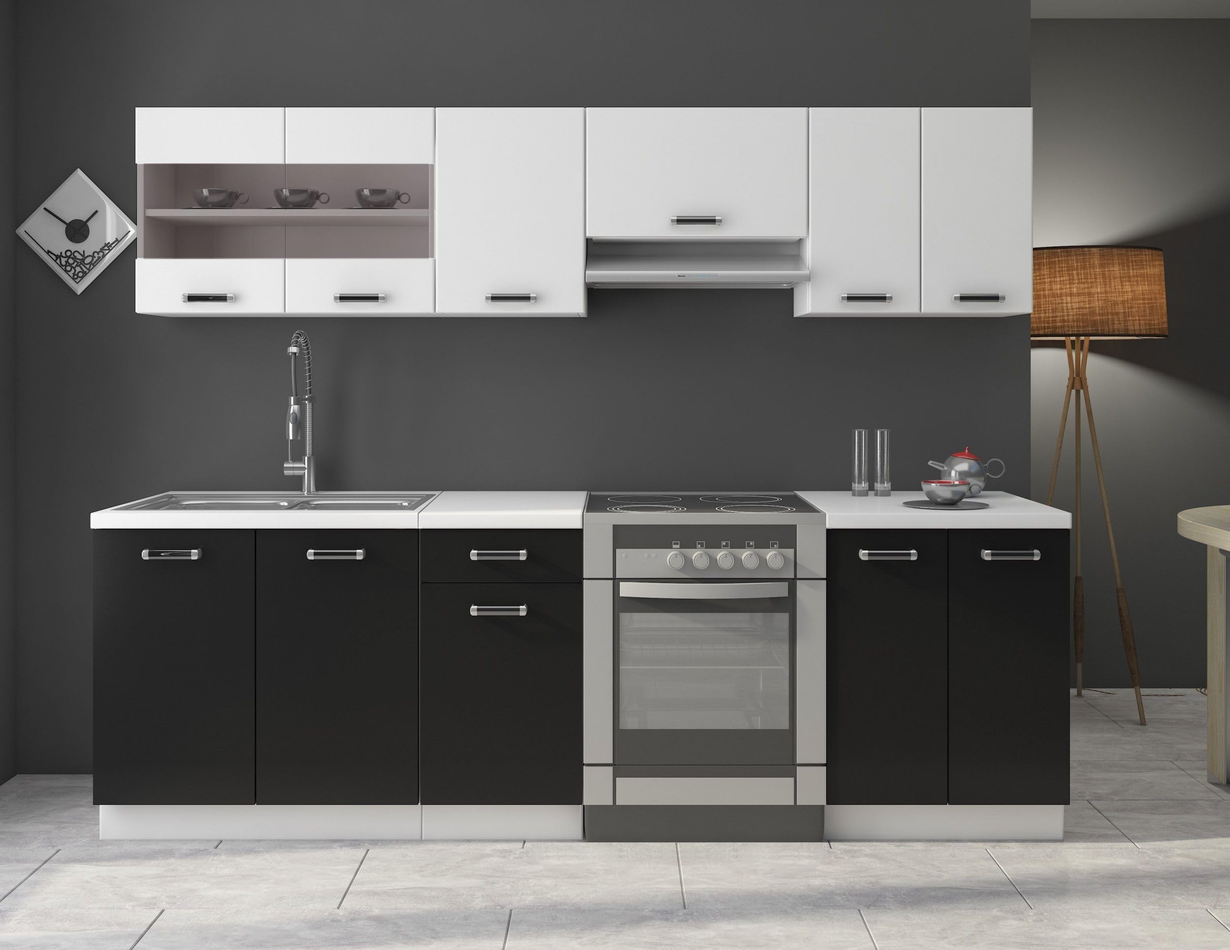 Kuechen-preisbombe Küche Omega 240 cm Küchenzeile Küchenblock variabel stellbar in Schwarz Weiss